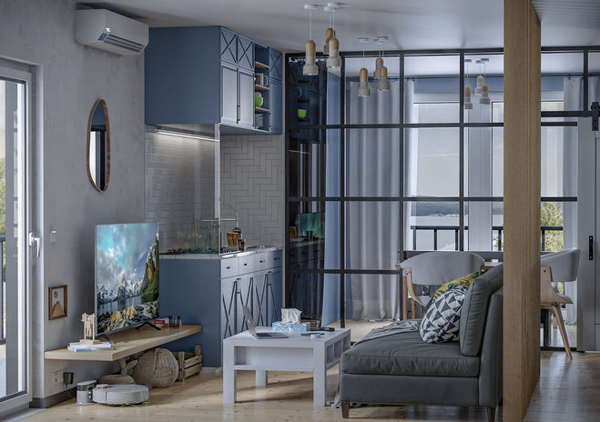 Arhitektonska vizualizacija penthousea u Vukovarskoj ulici prikazuje moderan interijer u svijetloplavim i smeđim tonovima, kombinirajući svježinu i toplinu kombinacijom materijala i boja. Otvoreni tlocrt spaja dnevni boravak, blagovaonicu i kuhinju, dok minimalistički namještaj i elegantni detalji dodaju sofisticiranost. Korištenje naprednih tehnika, stvorili smo realistične 3D vizualizacije do najsitnijih detalja koji su klijentu omogućili jasan uvid u izgled budućeg prosotra.