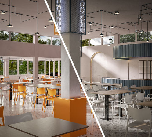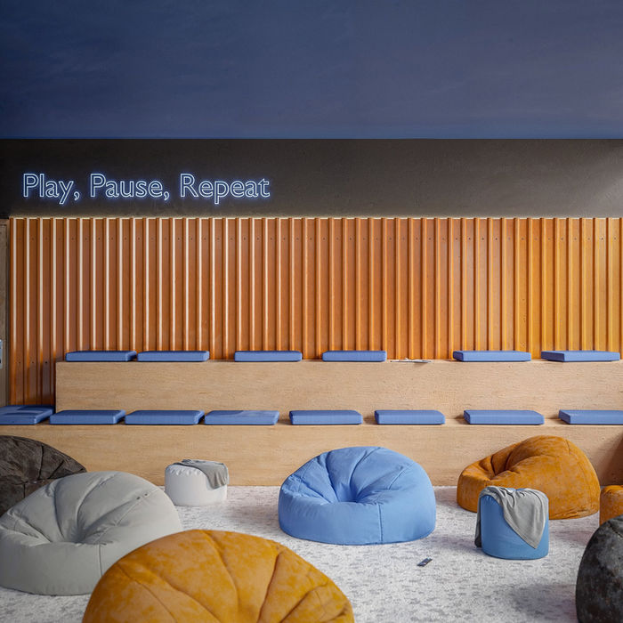 Game room s plavim zidovima, istaknutim narančastim detaljima i neon svjetlima stvara dinamičnu atmosferu. Drvene tribine nude udobno mjesto za gledanje igara, dok su bean bagovi idealni za opušteno igranje. S naglaskom na interaktivnoj atmosferi, game room postaje omiljeno mjesto za druženje i zabavu. Ova preobrazba prostora zahtijevala je detaljno izrađene 3D vizualizacije kako bi se postigao željeni izgled. Klijent je pružio nacrte prostora uz moodboard i sve relevantne materijale, na temelju kojih su napravljene konačne vizualizacije. Proces je uključivao nekoliko revizija kako bi se osiguralo potpuno zadovoljstvo klijenta i postigao željeni izgled prostora.